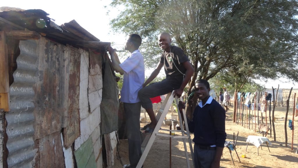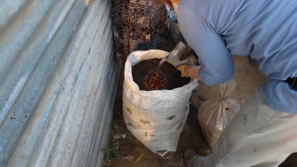 Außerdem probieren wir das „Flaschenlicht“ (www.aliteroflight.org) und Gemüse aus dem Sackgarten aus. Auch die Mütter von Precious und Lorenzia bekommen einen Gemüsesack. Hinein kommt Kohl, Zucchini, Spinat, Busch-Bohnen und Möhren (das untere rechte Bild zeigt unseren Versuch in Deutschland). Dabei helfen uns drei wissbegierige junge Männer aus Frau Schauenburgs Nachmittags-Klasse. Das Flaschenlicht klappt super, es leuchtet mit der Kraft einer 50Watt Glühlampe. Die Gemüsesäcke müssen sich erst entwickeln. Es ist aber im Juli leider Winter und somit ziemlich kalt. Wir arbeiten mit den jungen Männern zusammen, zeigen ihnen wie es geht und lassen ihnen das nötige Werkzeug da, so das sie auch ohne uns die Möglichkeit haben, dieses Projekt weiterzuführen.