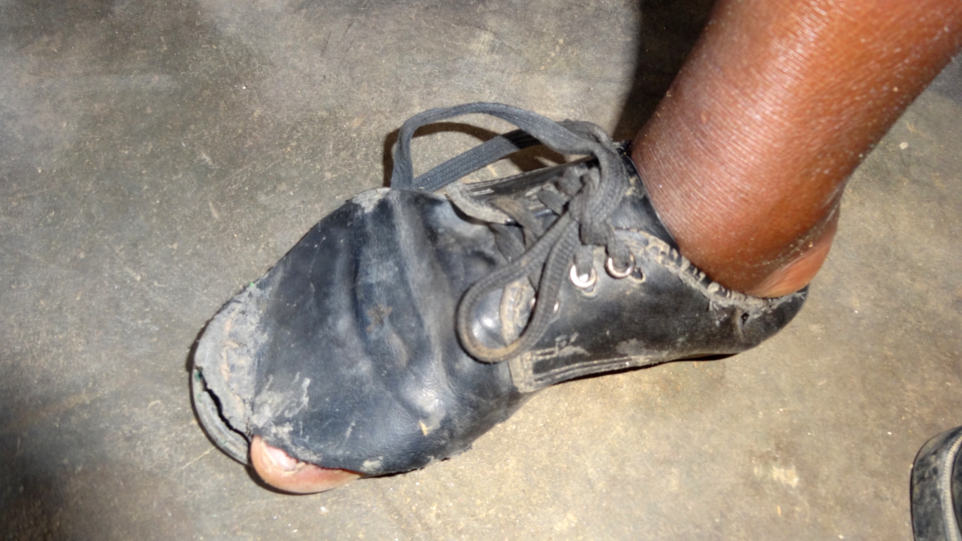 Im Januar waren wir, mein Mann Thomas Vollmar und ich, wieder vor Ort und haben geholfen, Schuluniformen und Schulmaterialien zu verteilen. Grundsätzlich gibt es nicht immer einen kompletten Satz Schuluniform für jedes Kind, sondern was noch gut erhalten ist, kann noch weiter genutzt werden. Bei manchen Sachen wie z.B. bei diesen Schulschuhen musste man jedoch über einen Austausch nicht lange nachdenken …